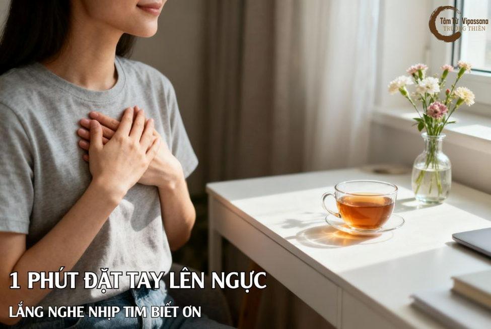 Hướng dẫn thiền 1 phút đặt tay lên ngực – cảm nhận nhịp tim, hơi thở và lòng biết ơn trong chính mình cùng Trường Thiền Tâm Từ Vipassana.