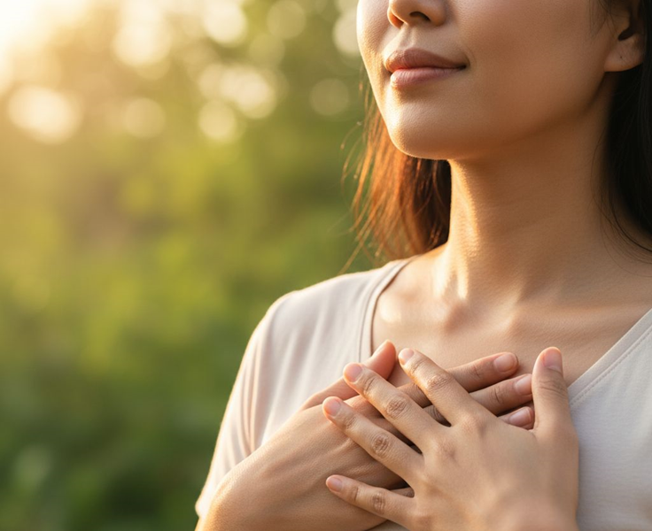 Đặt tay lên vai hoặc ngực, cảm nhận hơi ấm từ chính cơ thể mình. Không ai khác – chỉ bạn với bạn.