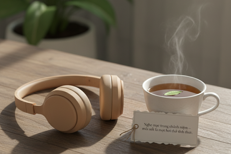 Chỉ một phút thôi, nếu ta dừng lại, thả lỏng vai, khép mắt, và để từng nốt nhạc đi qua mà không phán xét, tâm sẽ lắng lại tự nhiên. Một phút ấy có thể biến chiếc tai nghe thành cánh cửa mở ra sự tĩnh lặng.