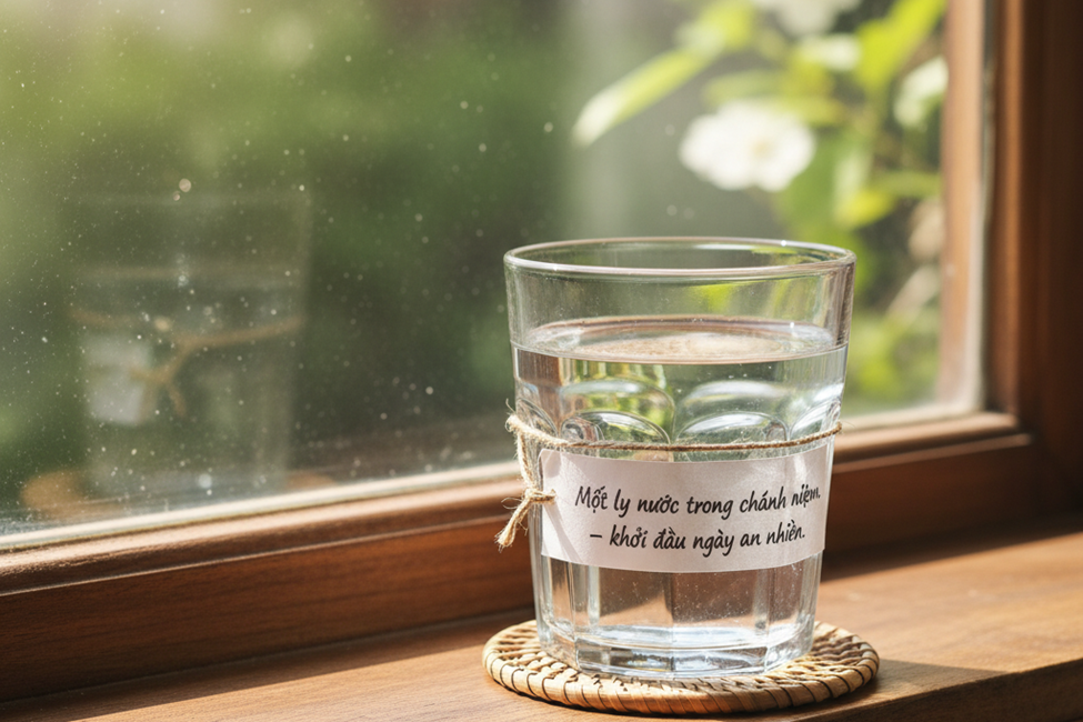 Buổi sáng, trước khi vội vàng mở điện thoại hay bước ra khỏi giường, hãy cho mình một phút thật chậm. Cầm ly nước trong tay, cảm nhận sự trong lành của dòng nước, hơi mát chạm môi, và nhịp thở trở về nhẹ như sương sớm.